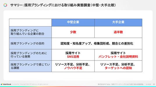 就活・転職活動に役立つキャリア学習サイト「talentbook」及び、法人向け採用ブランディング支援サービスを提供する株式会社PR Table(本社:東京都千代田区、共同代表取締役:大堀 航/大堀 海)は、採用に携わる人事担当者・責任者 428名、内、中堅企業(従業員数100名以上1,000名未満)在籍 216名、大企業(従業員数1,000名以上)在籍 212名を対象に、採用ブランディングにおける取り組み実態調査を実施いたしました。本リリースでは、調査結果サマリーをお知らせいたします。