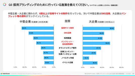 「採用ブランディングのために行っている施策を教えてください」という設問を聞いたところ、中堅企業・大企業に関わらず、6割以上が採用サイトの制作を行っているという結果でした。次いで中堅企業はSNS活用、大企業はパンフレット・会社説明資料がランクインしていました。