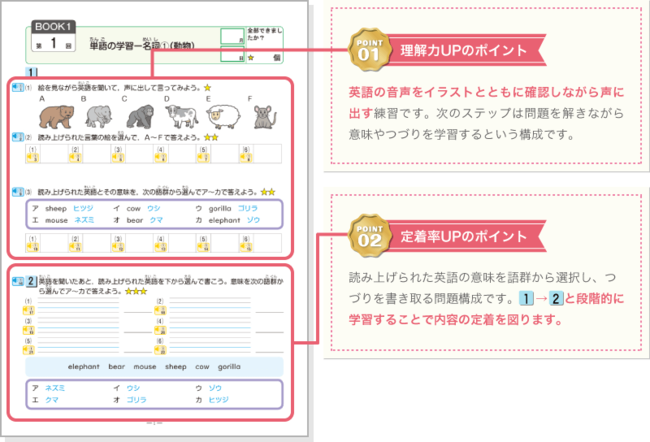 この教材では小学英語はもちろん、中学1年の学習内容を「楽しく」「効率よく」学習できます。