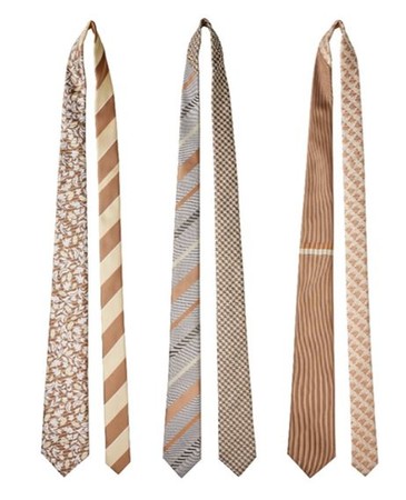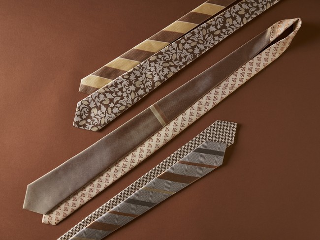 CACAO TIEシリーズは、レジメンタルと千鳥柄のリバーシブルタイ、結び目の少し下に2本ラインがポイントになるトラベルベルトタイ、カカオの絵柄が入ったボタニカル柄のタイという3種類のデザインをご用意。