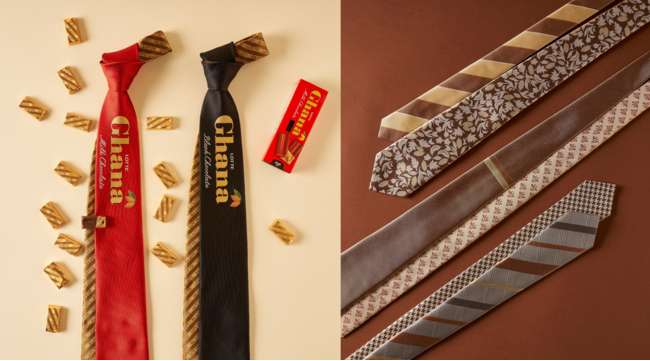 ロッテとのコラボレーションアイテムには、「Ghana TIE」シリーズと「CACAO TIE」シリーズ、2つのラインが登場します。「Ghana TIE」シリーズは、見た目にも可愛くおいしそうなデザインに、「CACAO TIE」シリーズは、カカオで染めた絹糸で生地から作り、品よく日常的に使いやすいデザインに仕上げました。バレンタインのギフトにピッタリのアイテムたちが揃っています。