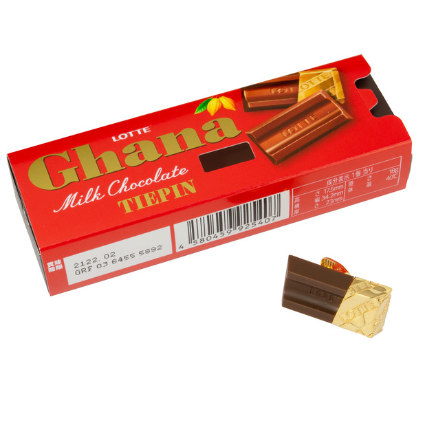 ロッテのロングセラー商品「ガーナ」。ちょっと一息つきたいとき、集中したい作業のお供に。いつも私たちのそばで小さなハッピーを届けてくれる「ガーナ」。そんな「 ガーナ」とgiraffeが出会い、異色のコラボレーションによる限定アイテムができました。赤と黒が目を引くキャッチ―なネクタイと、今にも甘い香りがしてきそうなキュートなタイピン。