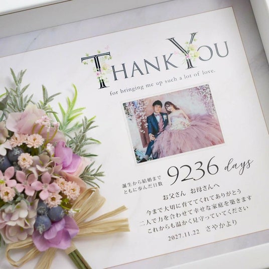 両親ギフトで人気の高い「子育て感謝状」。お花アレンジ、お写真、カウント数字、メッセージが入るタイプは特に人気で、BOXタイプはホコリを気にせず飾れるのも嬉しいポイントです。