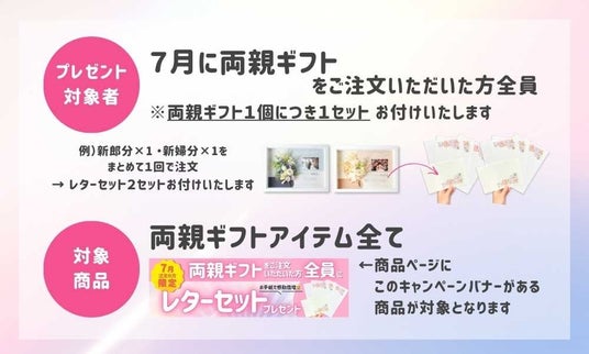 結婚式や各種イベント向けアイテムを企画・制作・販売している、株式会社ファルべ(本社:広島市 代表取締役:宮村志穂)が、7月中に両親贈呈品をご注文くださった方限定のプレゼントキャンペーンをスタートしました。