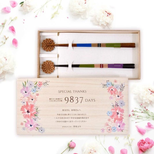 感謝のメッセージや生まれた日から結婚式までのカウントが入る子育て感謝状を桐箱にUV印刷してしあげた特別仕様のお箸ギフトです。
