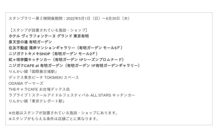 住友不動産商業マネジメント株式会社(本社:東京都新宿区 代表取締役社長:山本 直人)が、運営・管理する複合商業施設「有明ガーデン」(所在:東京都江東区)で開催中の、「有明ガーデン×ラブライブ!虹ヶ咲学園スクールアイドル同好会 トキメキ有明ツアー!」の最新情報をお知らせいたします。