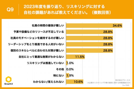 「Q9.2023年度を振り返り、リスキリングに対する自社の課題があれば教えてください。(複数回答)」(n=104)と質問したところ、「社員の時間の確保が難しい」が34.6%、「予算や設備などのリソースが不足している」が28.8%、「社員のモチベーションを維持するのが難しい」が28.8%という回答となりました。