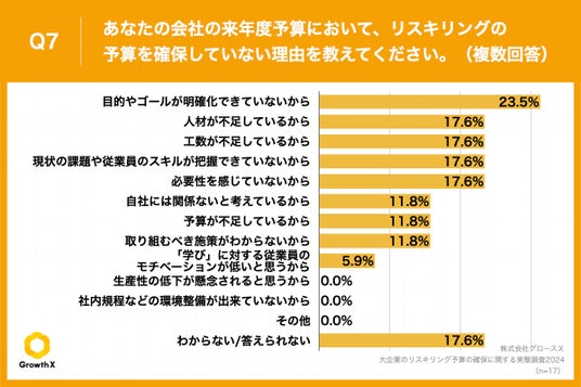 Q1で「していない」と回答した方に、「Q7.あなたの会社の来年度予算において、リスキリングの予算を確保していない理由を教えてください。(複数回答)」(n=17)と質問したところ、「目的やゴールが明確化できていないから」が23.5%、「人材が不足しているから」が17.6%、「工数が不足しているから」が17.6%という回答となりました。