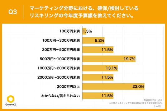 Q2で「確保している」「検討している」と回答した方に、「Q3.マーケティング分野における、確保/検討しているリスキリングの今年度予算額を教えてください。」(n=61)と質問したところ、「3000万円以上」が23.0%、「500万円~1000万円未満」が19.7%という回答となりました。
