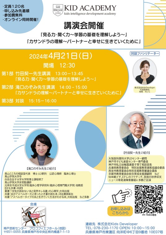 この度、カサンドラの研究をされている滝口のぞみ先生といつもKID ACADEMYを支えてくださっている竹田契一先生をお招きして、講演会を開催することになりました。対談では、相馬れいこ氏がファシリテーターを務めます。
