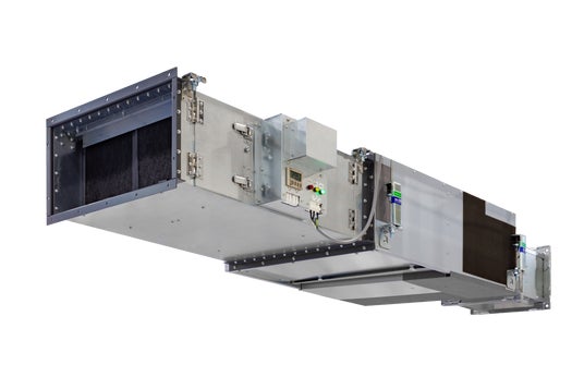 株式会社大気社(本社:東京都新宿区、代表取締役社長:長田 雅士)からのオーダーにより受託製造した天井裏ダクト接続型除菌システムです。除菌効果の高い深紫外光(UVC)LEDを光源に採用し、光触媒フィルターと組み合わせることで、室内空気中の細菌やウイルスだけでなく、カビや VOC(揮発性有機化合物:シックハウス症候群や、においの原因になる物質の総称)も、効果的に削減することができます。