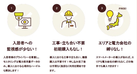 既存の電力メーター(スマートメーター)を活用し、電力使用量の変化量を測定することで、生活の異常を早期に発見するサービスです。異常を検知した際には、あらかじめ登録された連絡先へ迅速に自動通知を行います。 特徴として、低コストかつ工事不要で導入できることが挙げられ、新たにご契約いただく方だけでなく、すでにご入居中の賃貸住宅を中心として導入が進んでいます。見守りについては、特定の電力会社だけではなく、どこの電力会社でも、加入が可能であることが不動産会社様から好評をいただいております。