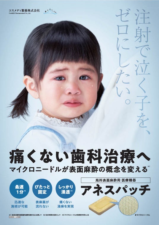 コスメディ製薬は歯科治療における「痛み」の課題を軽減する、局所表面麻酔用マイクロニードル医療機器『アネスパッチ』を開発、2023年に発売しました。同製品は患者さま、歯科医双方の負担を軽減する医療機器として歯科業界で高く評価され、歯科治療の現場では小児乳歯抜歯の浸潤麻酔やスケーリング(歯石除去)、SRP、口内炎処置の痛みの軽減に用途が拡大。さらにマイクロニードル技術を応用した、歯周病治療用途のドラッグデリバリーシステム(DDS)開発が国内大学との産学連携で進行しています。