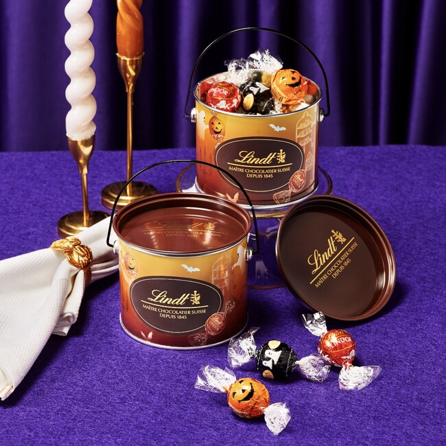 ハロウィンデザインのバケツ缶の中に、期間限定フレーバーや人気の「キャラメル」を含む12個のリンドール入り。持ち手付きで、ハロウィンのお楽しみ「トリック オア トリート」を心待ちにしているお子様へのプレゼントにもおすすめです。