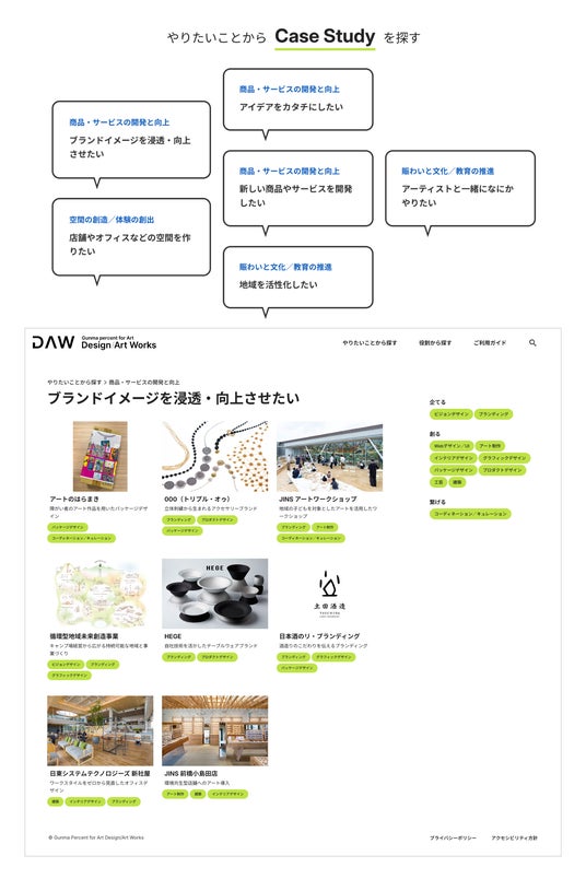 データベースの主な利用者として、デザインやアートにこれまで取り組んでいない事業者や県民を想定しています。そこでアートやデザインのカテゴリー別分類ではなく、利用者目線でやりたいこと(新しい商品を作りたい、地域を活性化させたいなど)から事例が検索できるようになっているのが、このデータベースの最大の特徴です。さらに事例やクリエイターに付与された複数のタグから、類似の事例やクリエイターに飛ぶことも可能です。様々なケーススタディや、それを担ったクリエイターを知っていただくことで、アートやデザインを気軽に活用してもらう一歩への助けとなるツールになることを目指しています。