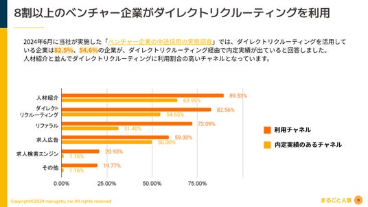 近年、ダイレクトリクルーティングは採用手法として一般化し、2024年6月にマルゴトが実施した「ベンチャー企業の中途採用の実態調査」によると、約8割の企業が活用していると回答しています。