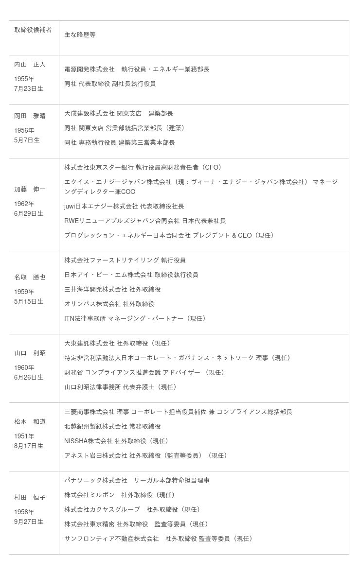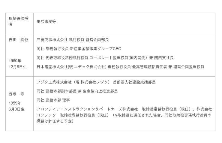 当社らが提案する取締役候補者のうち、吉田氏、登坂氏、内山氏、岡田氏及び加藤氏は、インフラ関連会社や建設会社を含む上場企業において取締役や部門トップを務めた実務経験を有しており、当社ら提案する企業価値向上策又はそれ以上の企業価値向上を実現できる人材です。また、当社らが取締役候補者として提案する名取氏、山口氏、松木氏及び村田氏並びに監査役候補として提案する野中氏は、いずれもガバナンスの専門家として高い専門性と独立性を有しており、東洋建設のガバナンス体制の再構築を担う人材です。