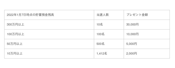 1. 2021年12月1日~2022年1月7日の間に、新たにみんなの銀行に10万円以上をご入金いただいたお客さまを対象に、2022年1月7日時点の貯蓄預金残高に応じて、抽選で総勢2,022名さまに以下のとおり現金をプレゼント