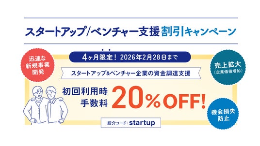 今回のキャンペーンは、これまで以上に増えている「初めてファクタリングを検討するスタートアップ・ベンチャー企業」の皆様に対し、より気軽にご活用いただくための割引特典(初回手数料20%OFF)を通じて、さらなる挑戦や拡大を支援したいという想いから実施を決定いたしました。