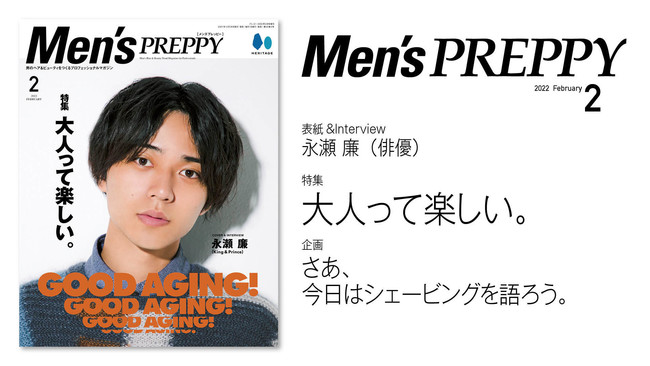 株式会社ヘリテージ(本社:東京都新宿区、代表取締役:齋藤 健一、以下 ヘリテージ)が発行する美容のプロのためのヘア&ビューティトレンド情報メディア『Men's PREPPY(メンズプレッピー)』より2022年2月号「大人って楽しい。」特集を2021年12月28日(火)に発売します。30代からの大人の魅力を倍増させる今回の特集は、2022年の大人男子のトレンドが詰まった1冊です。カットはもちろんのことシェービングまで、30代から抑えておきたい大人の嗜みをご紹介いたします。また、表紙と「気になる人と、」企画には、King & Princeの永瀬廉さんが登場!