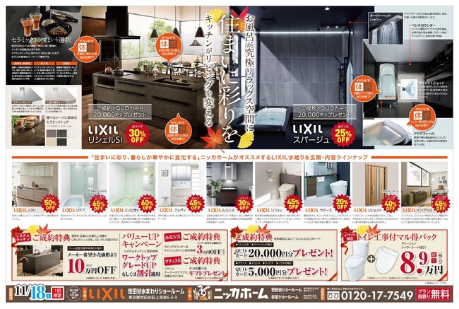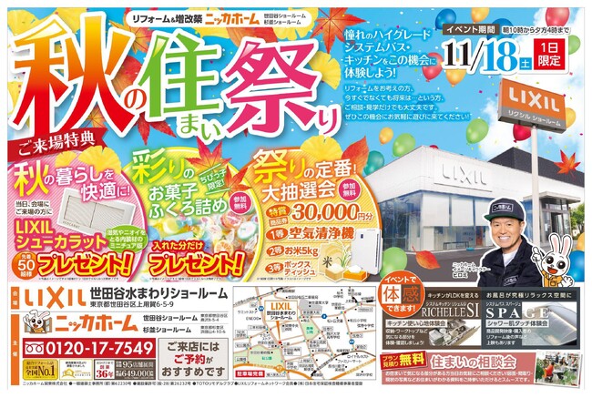 リフォーム&増改築のニッカホーム杉並店&世田谷店の2店舗合同で秋の住まい祭りを開催します!お得にリフォームができるチャンスです!11/18(土)はLIXIL世田谷水まわりショールームにお越しください!