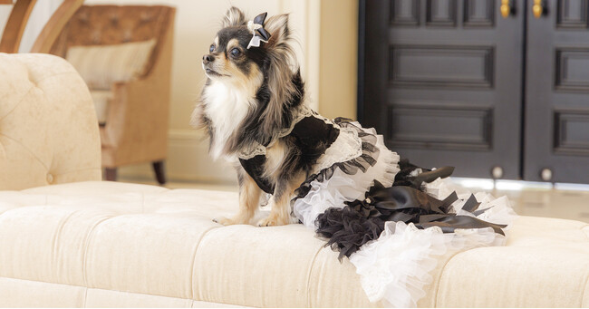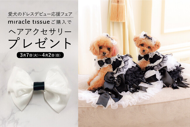 ミミーメリーの第1作目である「ミラクルティッシュ」ドレスのパンフレット一新を祝し、ミラクルティッシュご購入の方に、ドレスの魅力をさらに高める品のあるヘアアクセサリー(3,000円相当)を期間限定でプレゼントいたします。モノトーンコーデで愛犬の可愛さをプラス。これを機にあなたの愛犬もドレスデビューをしてみませんか。