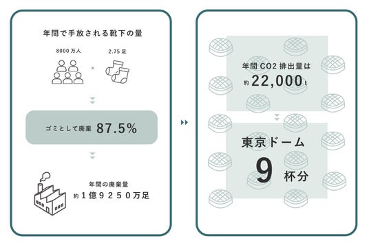 仮に日本の人口の15-70歳までの8000万人が、本調査の結果明らかになったように、年間で一人あたり平均2.75足の靴下を手放して、そのうち87.5%をゴミとして廃棄していると仮定すると、年間の廃棄量は合計1億9250万枚におよび、衣類の廃棄に伴うCO2排出量が1kgあたり2.29kg-CO2、靴下1足の重さを約100gと仮定すると、年間で約22,000トンものCO2排出量に加担していることがわかります。*3