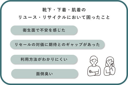 靴下・下着・肌着をリユース・リサイクルする際に、「どのようなことで困ったか」という問いに対する回答として、あまりに汚れすぎていて不安/臭い/使用感が気になる/リサイクルショップでは買い取ってもらえないなど、「衛生面で不安を感じたこと」や、思うように売れなかった/高くならないなど、「リセールの対価に期待とのギャップがあった」ことが挙げられました。