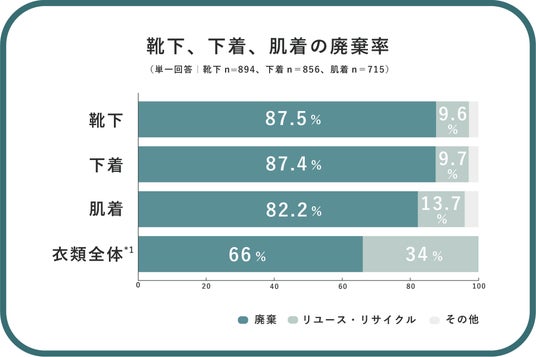 靴下・下着・肌着の手放し方について調査を行なったところ、約9割がリユース・リサイクルせずに廃棄していることが明らかになりました。環境省の調査 *1によると、家庭から廃棄した衣類全体のうち、ゴミとして廃棄されるものが66%であることを踏まえると、靴下・下着・肌着は、より廃棄されやすいカテゴリーであることが明らかになりました。