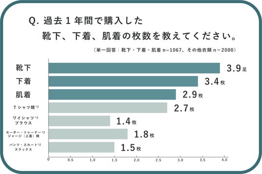 ● 過去1年間で購入した衣類の平均枚数は、靴下で3.9足、下着で3.4枚、肌着で2.9枚