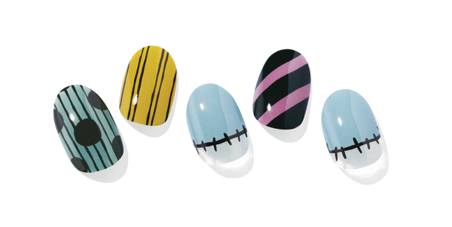ストライプ柄とドット柄が特徴的な『ティム・バートン ナイトメアー・ビフォア・クリスマス』のサリーのドレスをモチーフとしたネイル。サリーの縫い目を表現したピースと組み合わせることで、いたずら心をくすぐるような、ハロウィンの仮装にぴったりなデザイン。