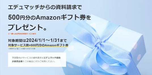 学習塾の先生が対象サービスの資料を請求すると、Amazonギフト券500円分(一部1,000円分の対象サービスあり)をプレゼントするキャンペーンを実施中です。サービス事業者の皆様、この機会にぜひ「エデュマッチ」へのサービス掲載をご検討ください。