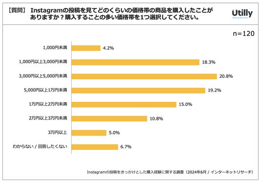 Instagramの投稿を見て購入したことがある商品の価格帯としては3,000円以上5,000円未満が20.8%でボリュームゾーンとなった。一方、5%は3万円以上と回答した。