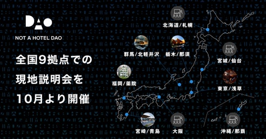 NOT A HOTEL(東京都渋谷区、代表取締役CEO:濱渦伸次、以下当社)は、新たなWeb3プロジェクトである「NOT A HOTEL DAO」※1のサービス始動に向け、10月より全国9拠点でNOT A HOTEL 開業済み拠点の現地見学会とオフラインイベントを開催することをお知らせいたします。