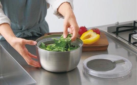 ボウルとザルを使って野菜を洗い、ツマミを掴んでくるくる回すと遠心力で素早く水が切れます。