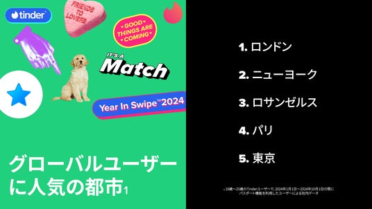 また、Tinderが毎年発表している、世界および日本のTinderユーザーのプロフィールやアクティビティ傾向をまとめたランキング「Year in Swipe」の2024年版によると、パスポート機能を利用する日本のユーザーの多くは行き先として国内の都市を選んでおり、東京、大阪、横浜、福岡、名古屋の大都市が人気の行き先としてラインクインしました。また、海外都市では、ロサンゼルス、ニューヨーク、パリ、マニラといった大都市がランクインしました。