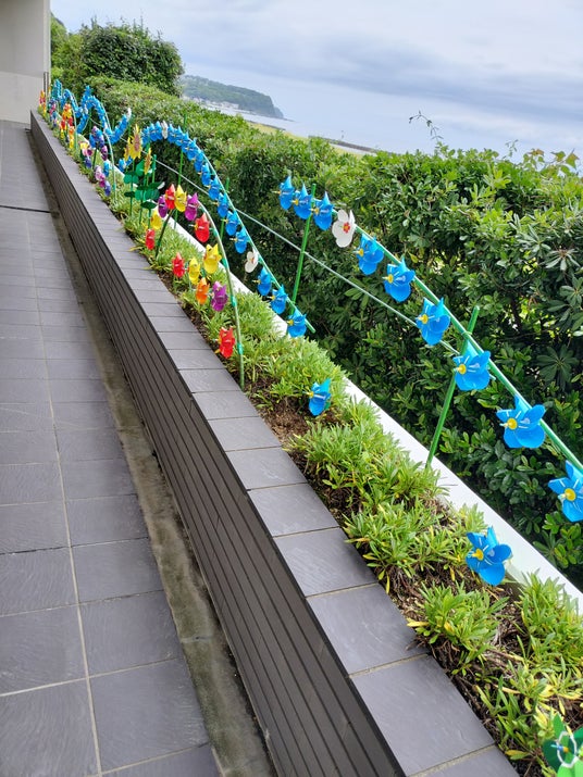 「河津温泉郷 海遊亭」ではイベント期間中、広井さんのアドバイスのもとスタッフが作成したかざぐるまで、施設内を飾り付けます。2024年6月13日現在、176のかざぐるまが飾られています。宿泊客の皆様には、フォトスポットとしてご活用いただけます。