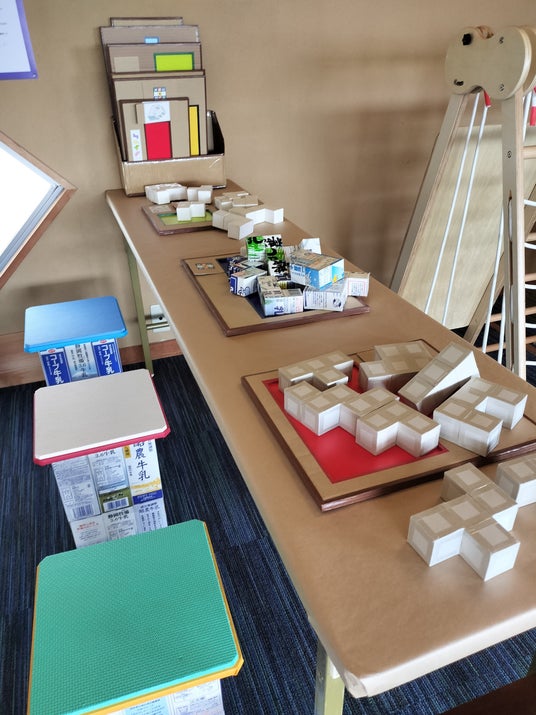 牛乳パックで制作した椅子(写真左)、ブロック(写真右手前)