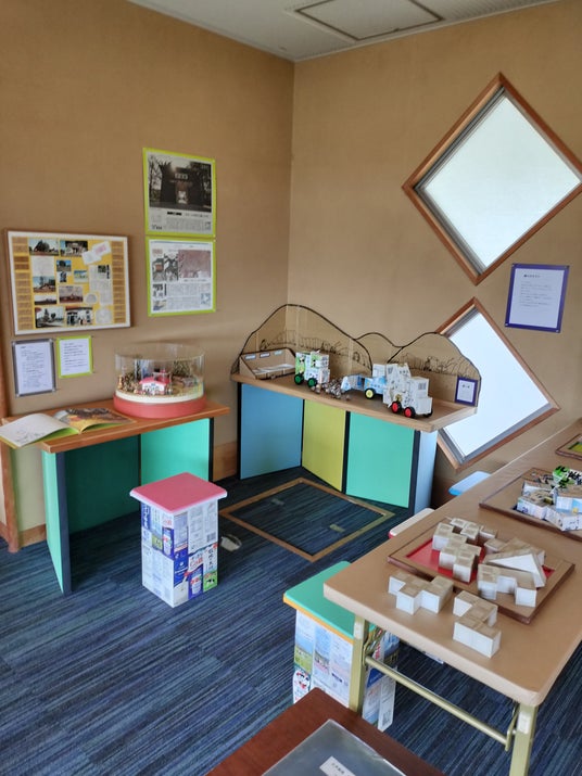 はたらくくるま、ブロック、牛乳パックで制作した椅子などの作品は、実際に手にとって遊んでいただいたり、座っていただくことが可能です。