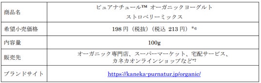 株式会社カネカ(本社:東京都港区、社長:藤井 一彦)は、有機JAS認証*1のヨーグルト『ピュアナチュール(TM) オーガニックヨーグルトストロベリーミックス』を9月24日(火)より新発売します。グループ会社であるカネカ食品株式会社(本社:東京都新宿区、社長:福崎 太)を通じて、オーガニック専門店、スーパーマーケット、宅配サービス、カネカオンラインショップ*2などで販売します。