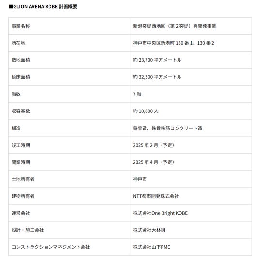 「神戸アリーナプロジェクト」を運営する株式会社 One Bright KOBE(住所:兵庫県神戸市、代表取締役社長 渋谷 順)は、神戸ウォーターフロントエリアに 2025年4月開業予定の日本初・270度海に囲まれた水辺のアリーナ「GLION ARENA KOBE(ジーライオンアリーナ神戸)」と屋外パークエリア「TOTTEI PARK」の一体運営により、日常的ににぎわいを生みだす神戸の最先端エンターテインメントエリアの創出を目指しています。