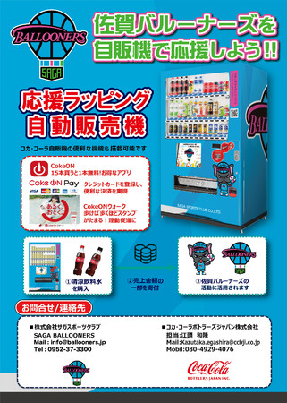 このたび佐賀バルーナーズでは、コカ・コーラボトラーズジャパン株式会社さまご協力のもと、クラブの応援自動販売機を設置することとなりましたのでお知らせいたします。