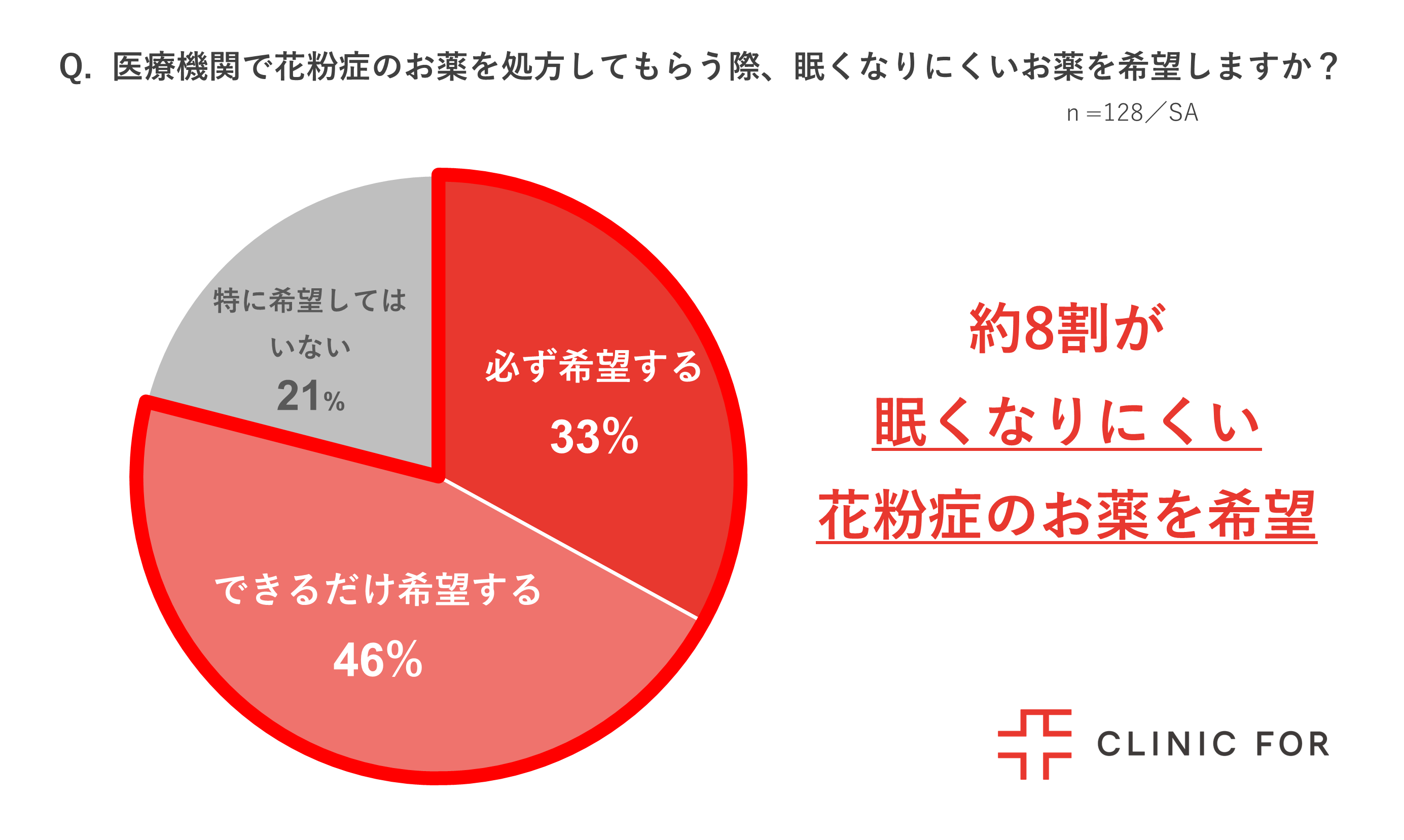 花粉症の症状で医療機関を受診する128名を対象に、花粉症薬を医療機関で処方される際に、眠くなりにくいお薬を希望するか調査しました。その結果、約8割(79%)が「希望する」と回答しました。