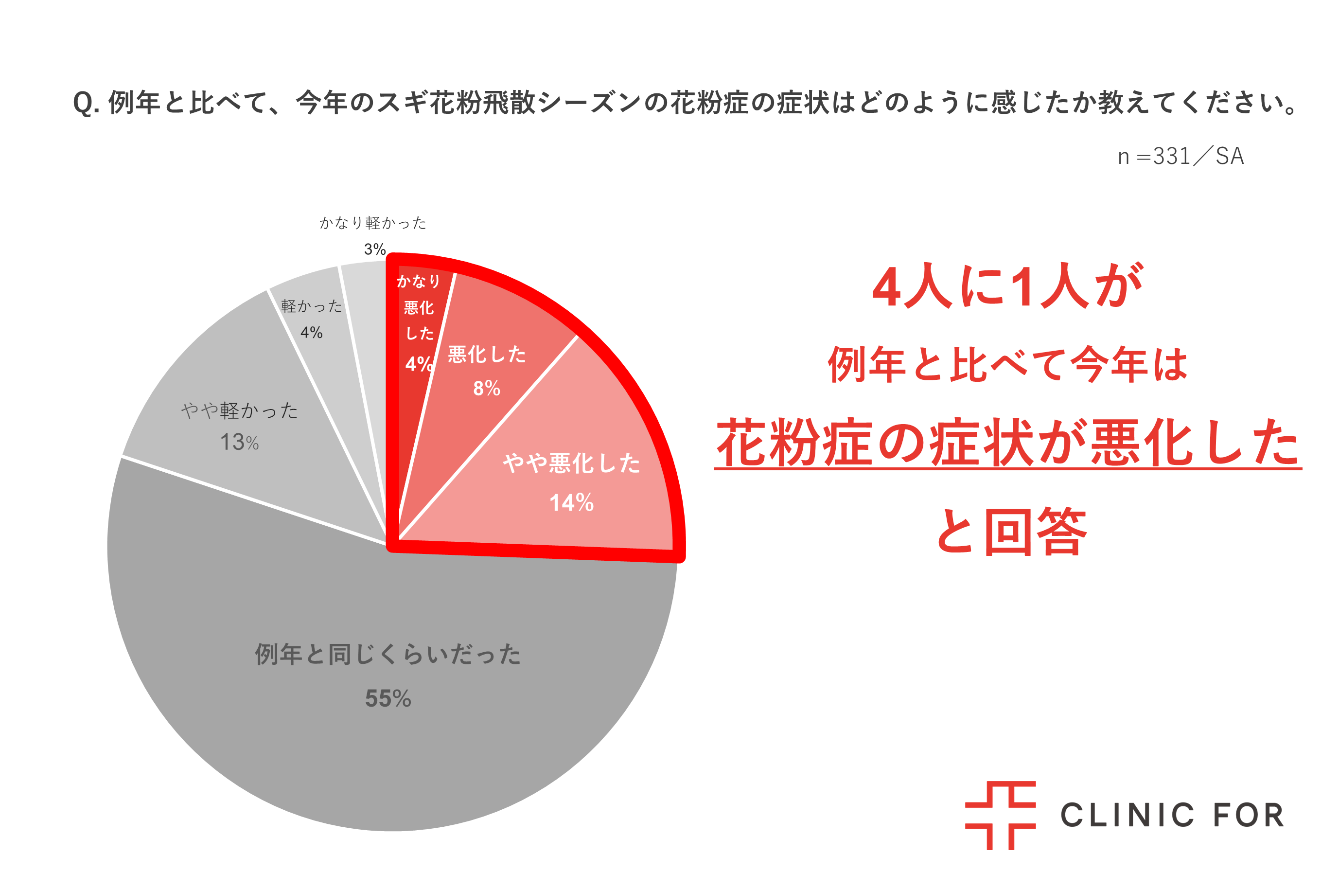 春の花粉症の人のうち、4人に1人が「今年春の花粉飛散シーズンは、例年と比べて症状が悪化した」と回答