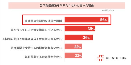 その結果、約半数は「やりたくない」と回答。理由について調査したところ、他項目と差をつけて「長期間の定期的な通院が面倒(56%)」が最多となりました。