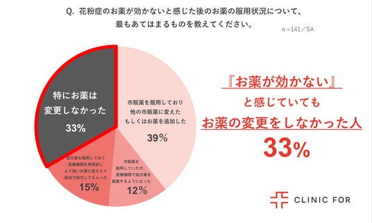 さらに、お薬が効かないと感じた際に、どのように対処したか尋ねたところ、「市販薬を服用しており、他の市販薬に変更またはお薬を追加した(39%)」、「市販薬を服用していたが、医療機関で処方薬を服用するようになった(12%)」「処方薬を服用しており医療機関を再受診しより強いお薬に変えたり追加で処方してもらった(15%)」と、66%が症状の改善に向け対処をしていました。一方で、特にお薬の変更をしなかった人は33%となりました。