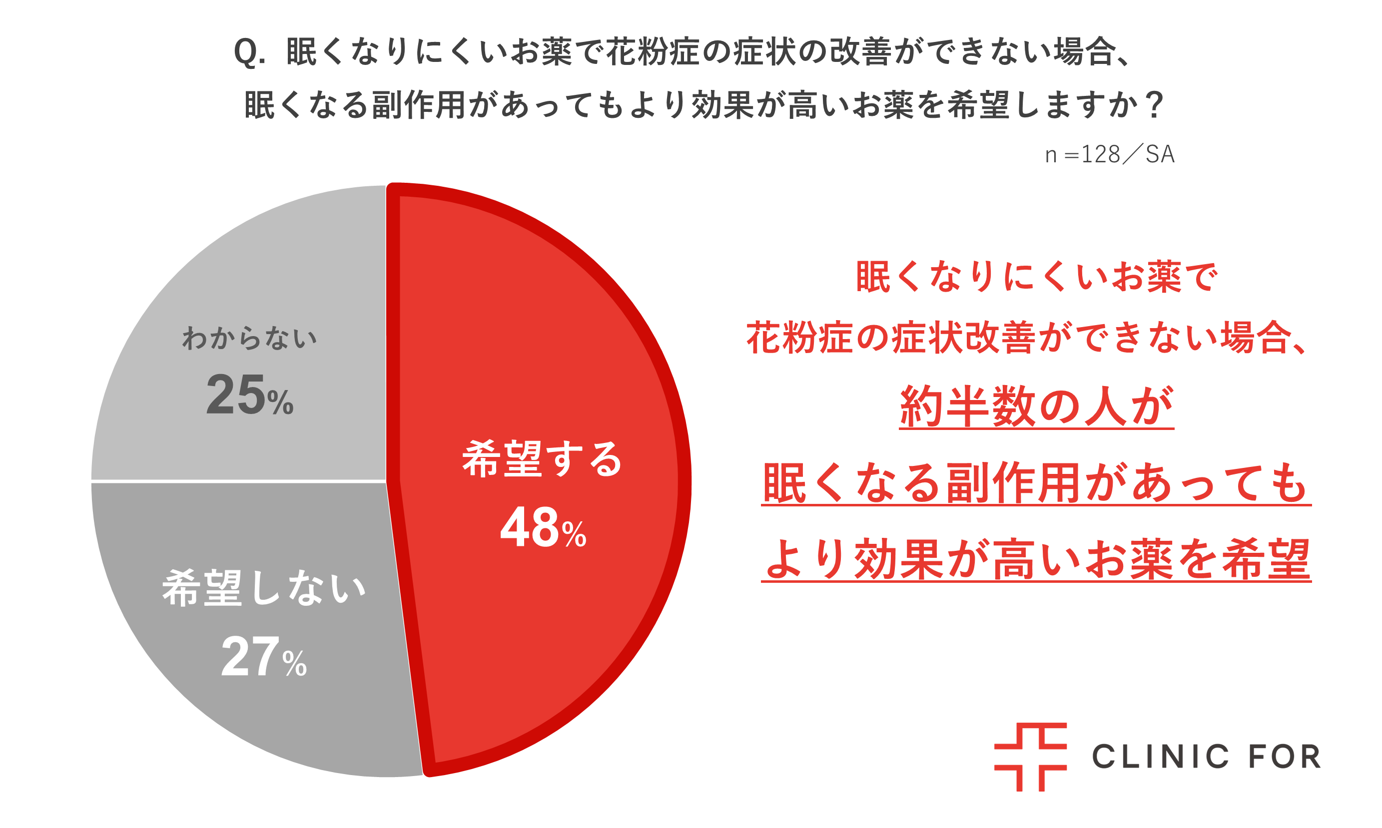また、眠くなりにくいお薬で花粉症の改善ができない場合、眠くなる副作用があってもより効果が高いお薬を希望するか尋ねたところ「希望する」と回答した人は約半数に上りました。