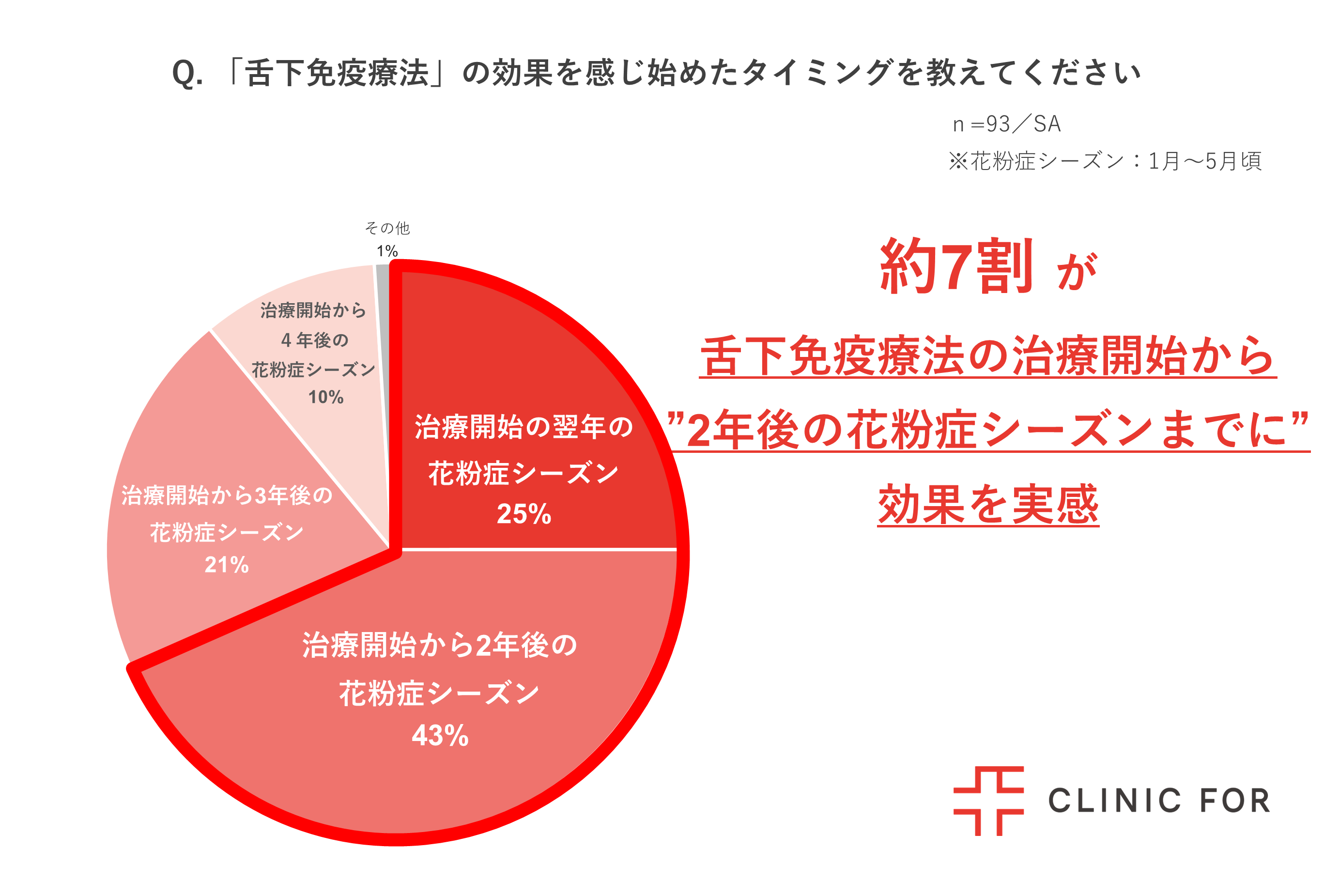 さらに「効果を感じている」と回答した93人に、効果を感じ始めたタイミングについて質問したところ、「治療開始の翌年の花粉症シーズン(25%)」「治療開始から2年後の花粉症シーズン(43%)」「3年後の花粉症シーズン(21%)」と回答。