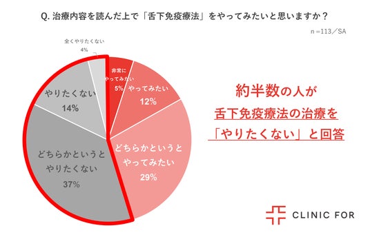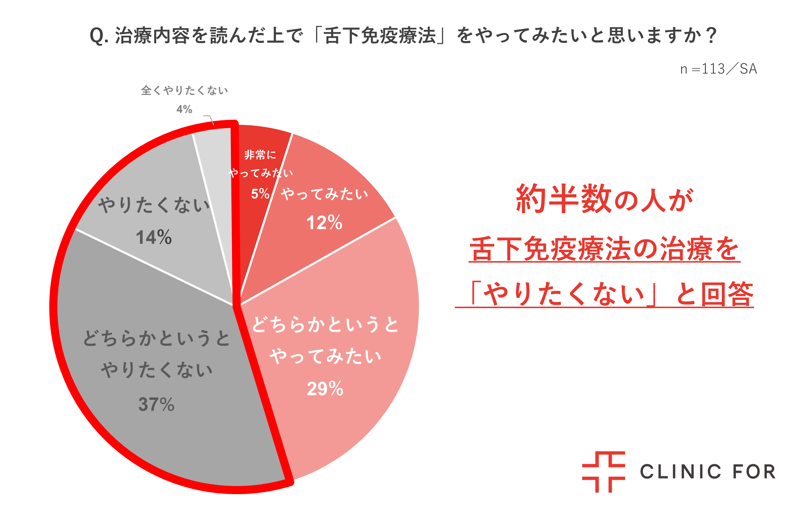 舌下免疫療法をやったことがない人113名に対し、舌下免疫療法の治療内容・期間・費用など概要を読んでいただき、やってみたいかどうか質問しました。