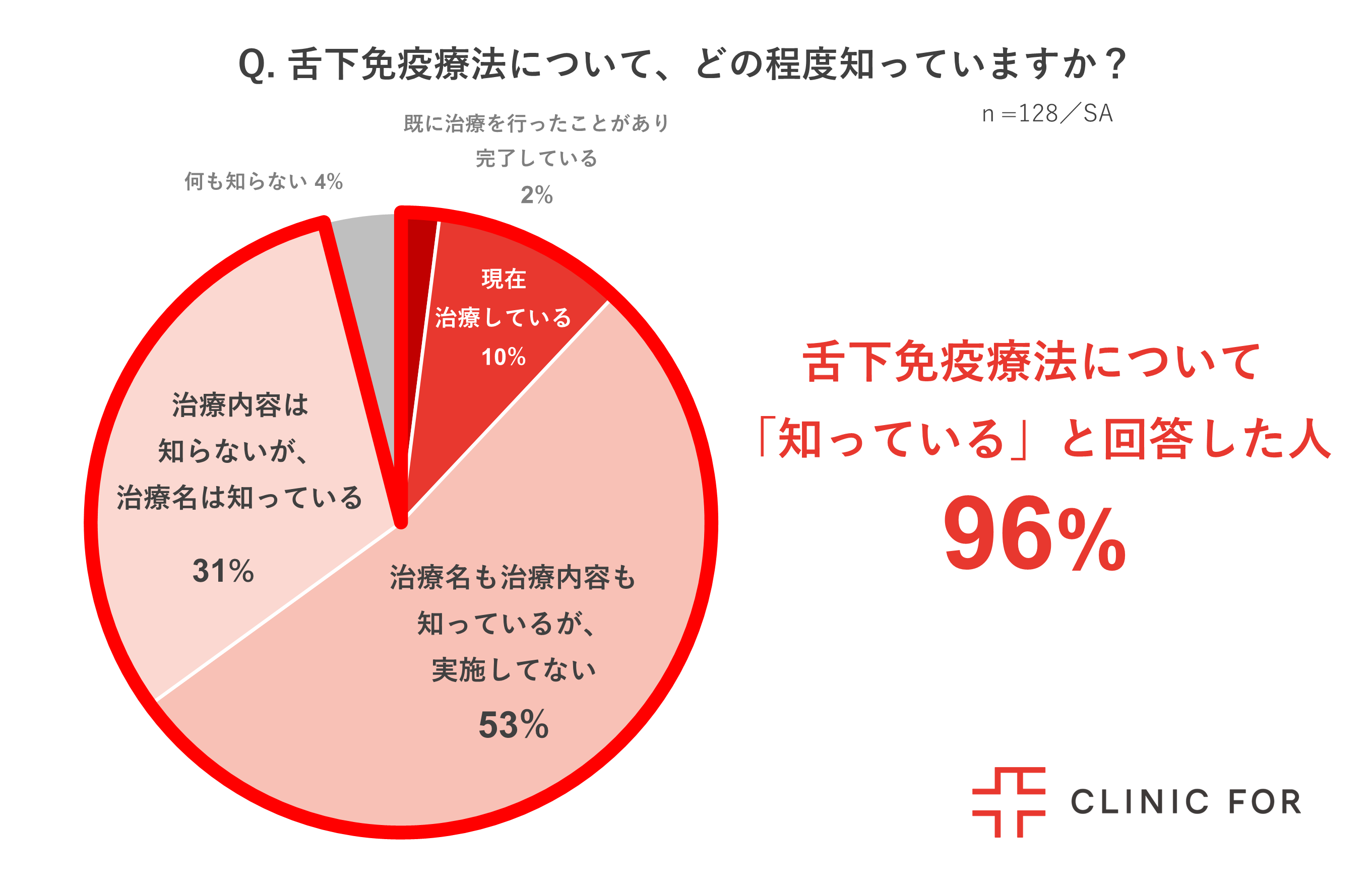 花粉症で医療機関を受診している128名を対象に、舌下免疫療法についてどの程度知っているかを調査したところ、「知っている」と回答した人は96%にのぼりました。そのうち、実際に治療を受けたことがある人は12%、治療内容まで理解している人は53%となりました。